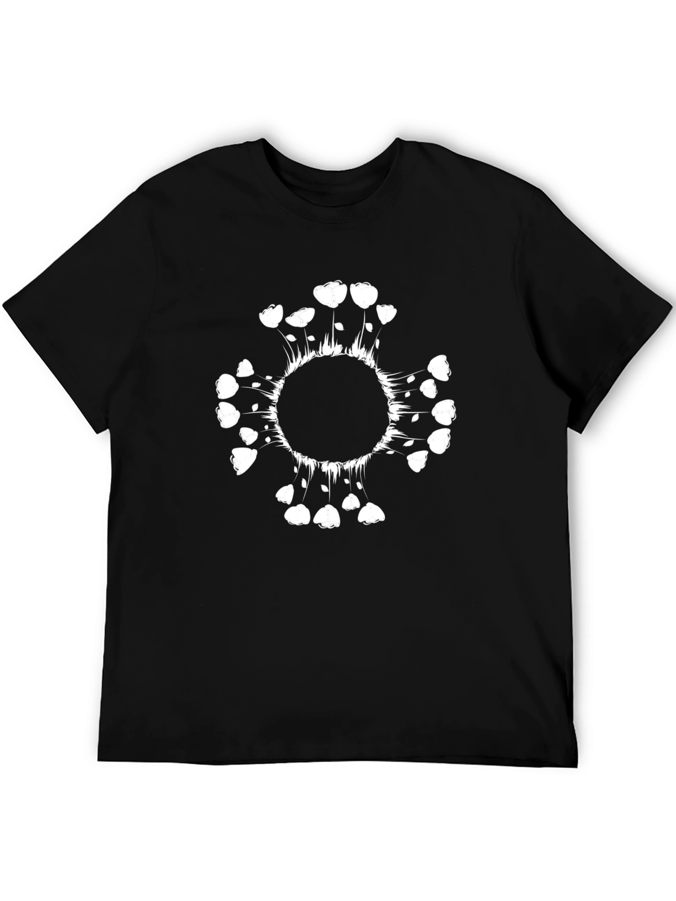 Show off your unique style with this eye-catching black t-shirt! Featuring an abstract floral design in white, this tee is sure to turn heads. The print showcases stylized flowers arranged around a central circular void, creating a modern and artistic look. Made from comfortable cotton, this tee is perfect for everyday wear. Dress it up with a blazer or keep it casual with jeans – this versatile piece will quickly become a wardrobe staple. Ideal for those who appreciate contemporary art and distinctive fashion.
