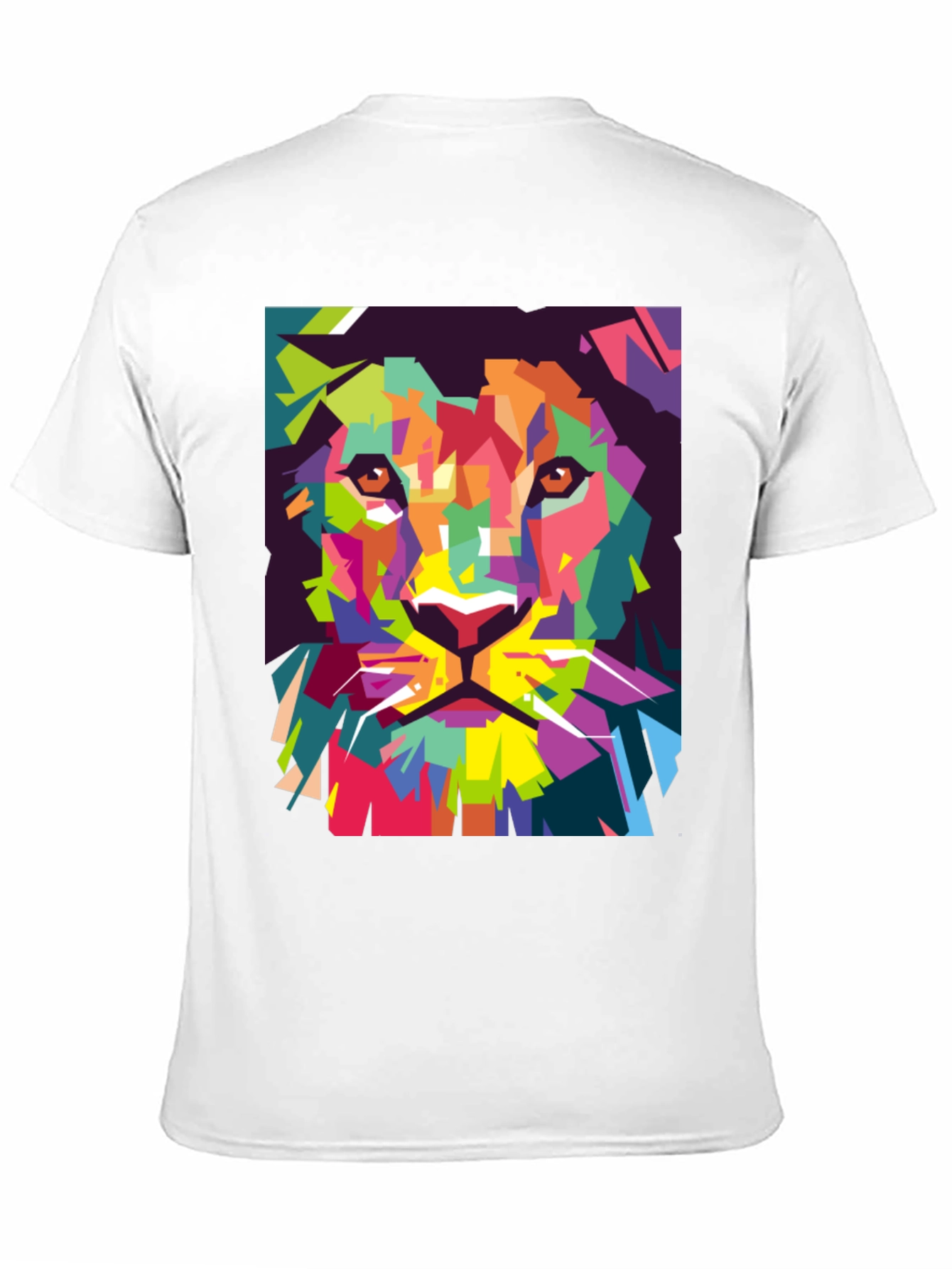 Make a bold statement with this unique t-shirt featuring a vibrant, abstract lion design. The eye-catching graphic is printed on a classic black tee, creating a striking contrast. Made from what appears to be a soft and breathable cotton blend, this shirt offers both comfort and style. Its relaxed fit makes it perfect for everyday wear, casual outings, or as a standout piece in your wardrobe. Show off your wild side with this conversation-starting tee that blends art and fashion.
