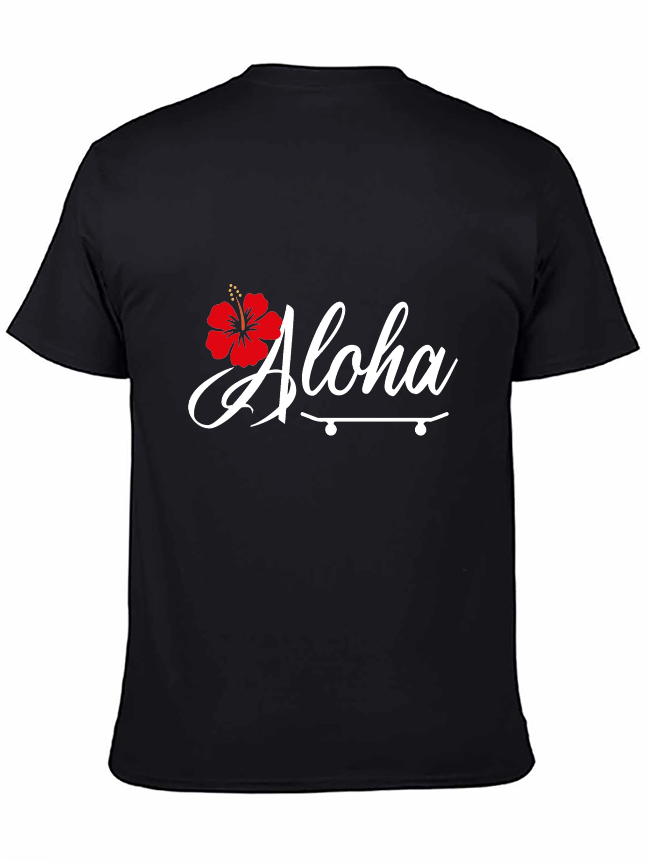 Embrace the island vibes with this stylish black t-shirt featuring a vibrant red hibiscus flower accenting a white "Aloha" script over a minimalist skateboard graphic. Made from a soft, comfortable fabric, this tee offers a relaxed fit perfect for everyday wear. The eye-catching design is ideal for showcasing your love for surfing, skating, or simply enjoying a laid-back, tropical lifestyle. Whether you're hitting the beach, cruising around town, or kicking back with friends, this Aloha-themed t-shirt adds a touch of effortless cool to any casual outfit. Get yours today and spread the Aloha spirit!
