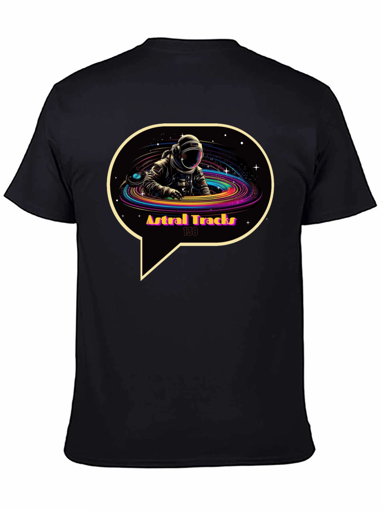 Journey into the cosmos with this unique black t-shirt. This stylish tee features a vibrant graphic of an astronaut immersed in a swirling vortex of color. The design is encased in a talk bubble outline, adding a modern and artistic flair. The shirt's dark background makes the bright colors pop, creating an eye-catching visual statement. Made from a comfortable and breathable fabric, this tee is perfect for casual wear or as a standout piece in any wardrobe. Ideal for space enthusiasts, art lovers, or anyone who appreciates bold and original designs, this shirt is sure to spark conversations and turn heads wherever you go.