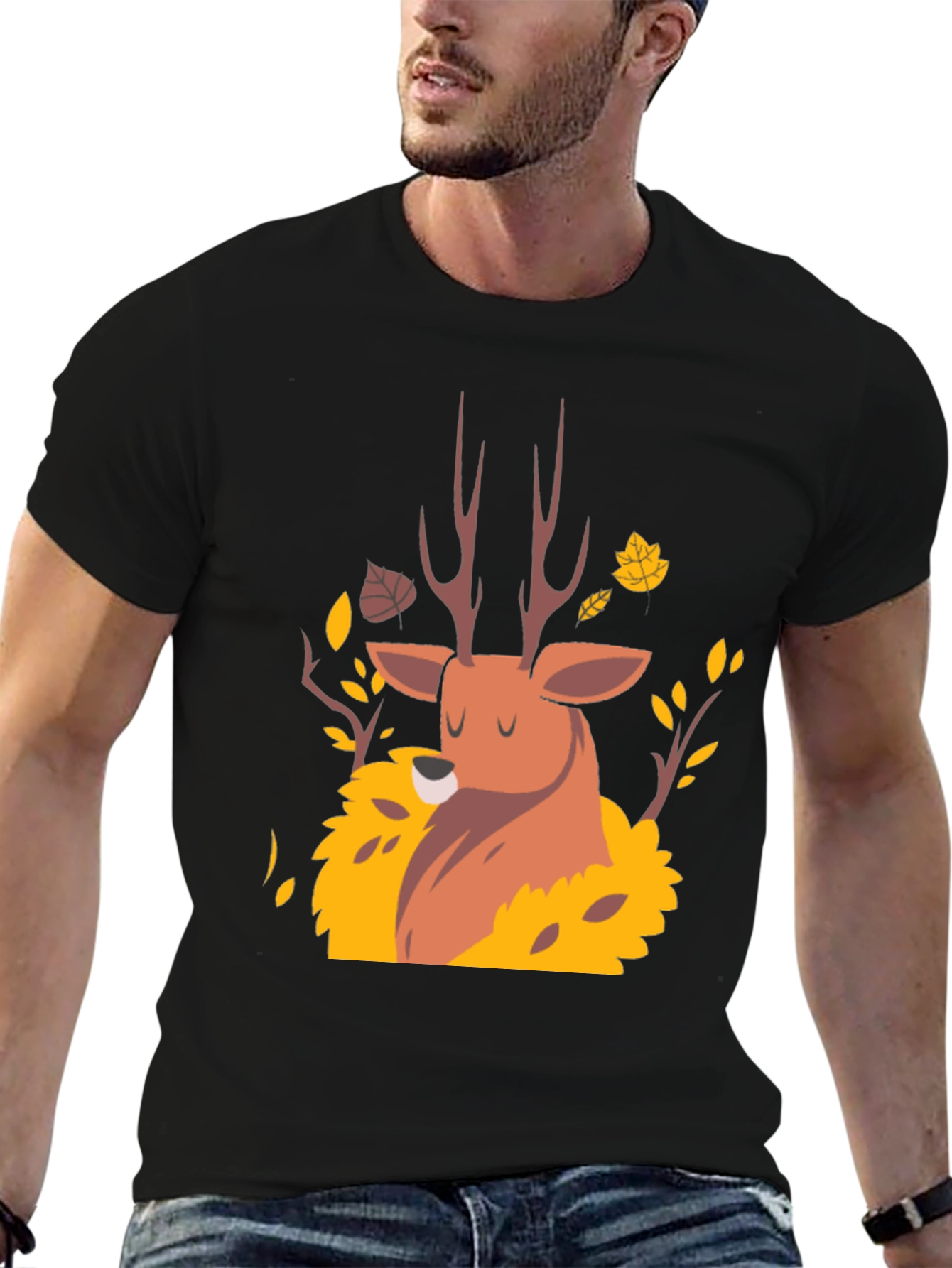 Embrace the spirit of fall with this unique black t-shirt featuring an adorable deer graphic. The design showcases a charming brown deer surrounded by autumn leaves and branches, rendered in a delightful cartoon style. This unisex tee is perfect for nature lovers, anyone who adores deer, or those simply wanting to express their love for the autumn season. Made from comfortable, breathable fabric, this classic crew-neck shirt is ideal for casual wear. Pair it with jeans, shorts, or layer it under a jacket for versatile styling. The eye-catching graphic is sure to spark conversations and add a touch of whimsy to your wardrobe. Get ready to showcase your style with this charming nature-inspired graphic tee!