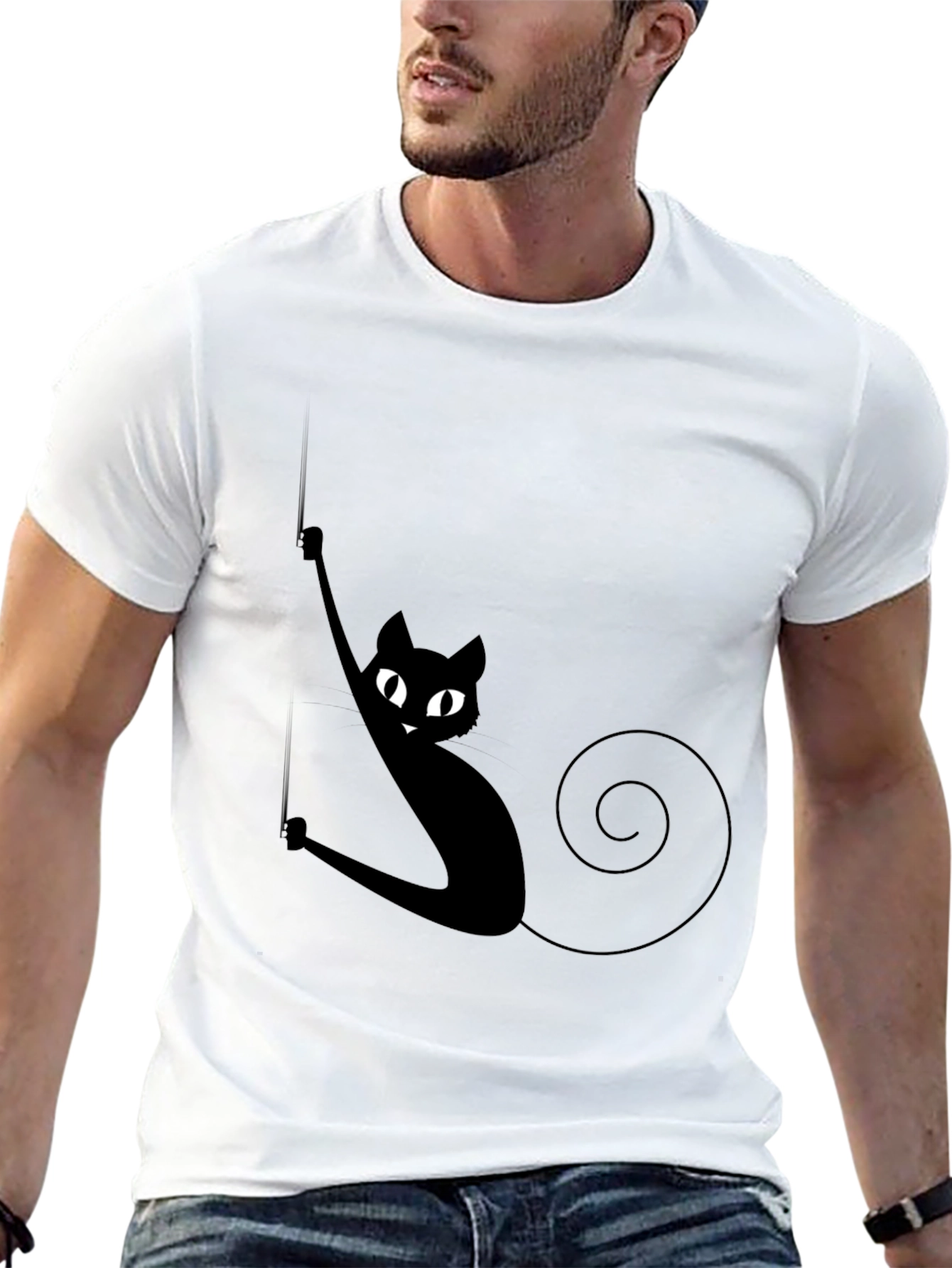 This sleek black t-shirt features a playful graphic design of a black cat playfully climbing a rope. The cat's silhouette is modern and eye-catching, complete with a long, curled tail that adds a touch of whimsy. Made from a comfortable-looking fabric, this shirt is perfect for casual wear and everyday activities. The dark color makes it versatile to pair with jeans, shorts, or chinos. Show off your love for cats with this unique and stylish t-shirt, sure to be a conversation starter!