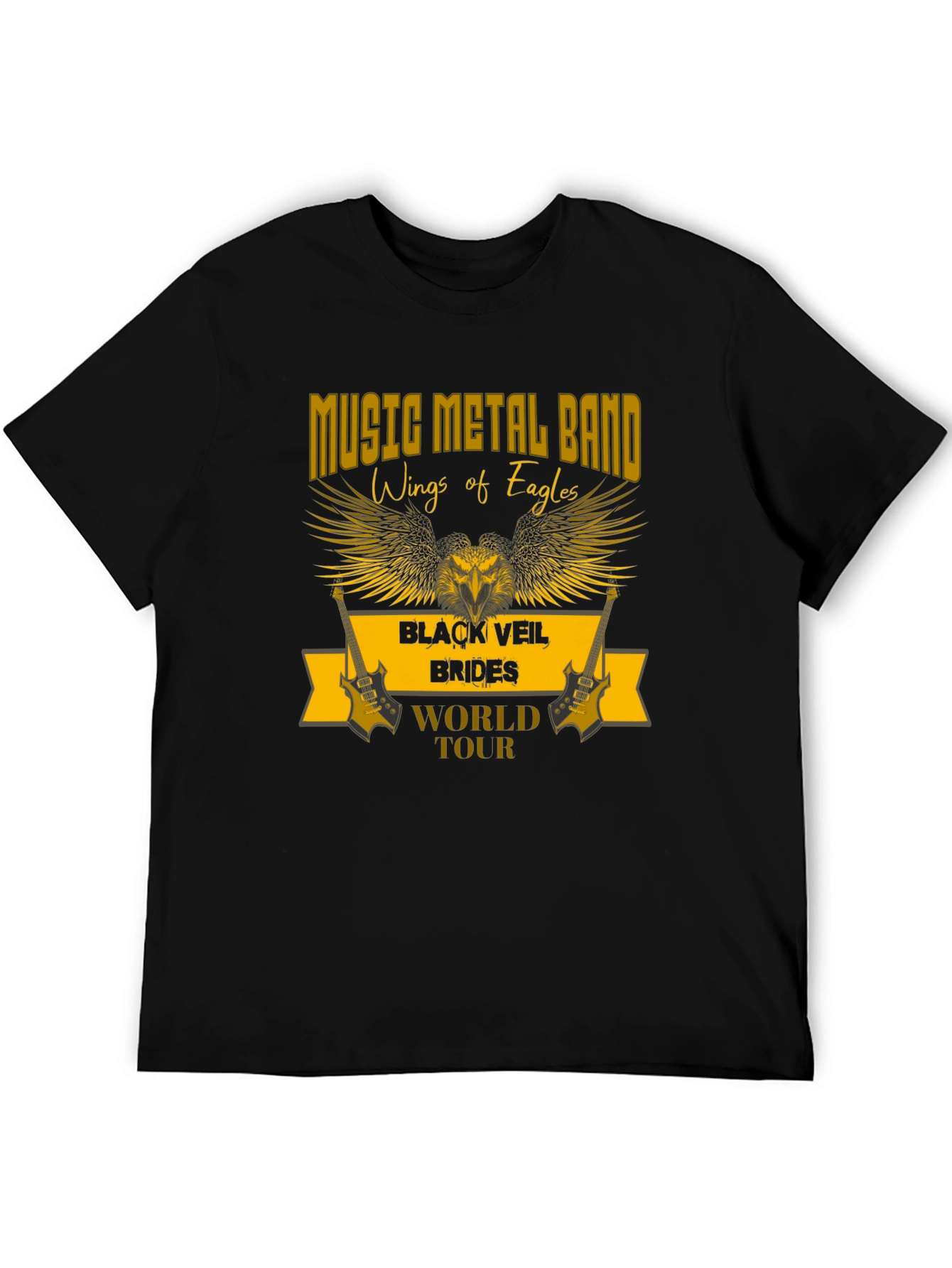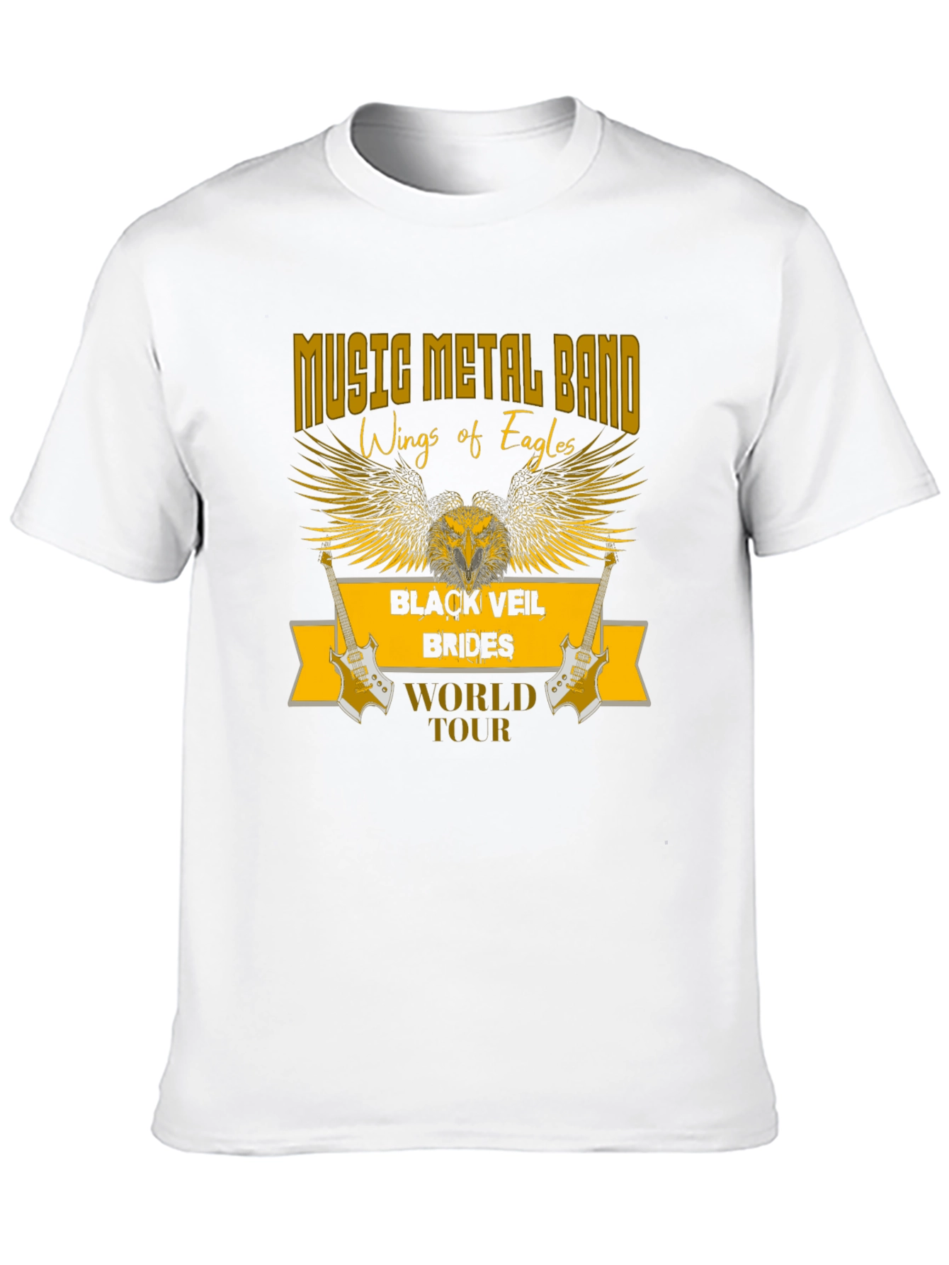 Rock your style with this bold, black graphic t-shirt! Featuring a striking golden design, it declares "Music Metal Band, Wings of Eagles" above a fierce eagle graphic. The "Black Veil Brides" logo sits prominently on a banner, flanked by stylized electric guitars. Beneath, "World Tour" announces a rocking concert experience. Crafted from soft, breathable fabric, this tee is perfect for concerts, casual wear, or showing off your love for metal music. Grab yours and join the tour!