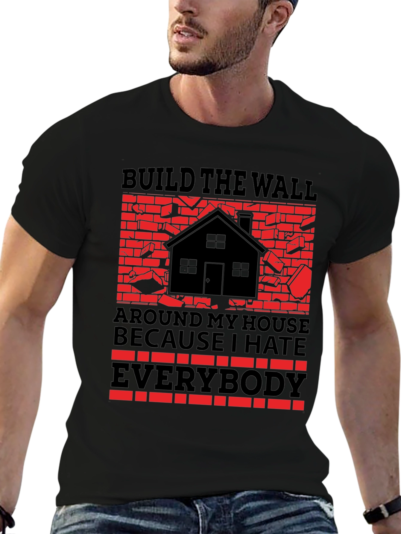 Show off your unique style with this eye-catching black t-shirt. Featuring a bold graphic that reads "BUILD THE WALL AROUND MY HOUSE BECAUSE I HATE EVERYBODY" with a stylized house and brick wall design, this shirt is sure to turn heads. Made from what appears to be soft and comfortable cotton, this tee is perfect for casual wear. The striking red and black color scheme adds a touch of edgy humor. Ideal for expressing your individuality or as a gift for someone with a similar sense of humor.
