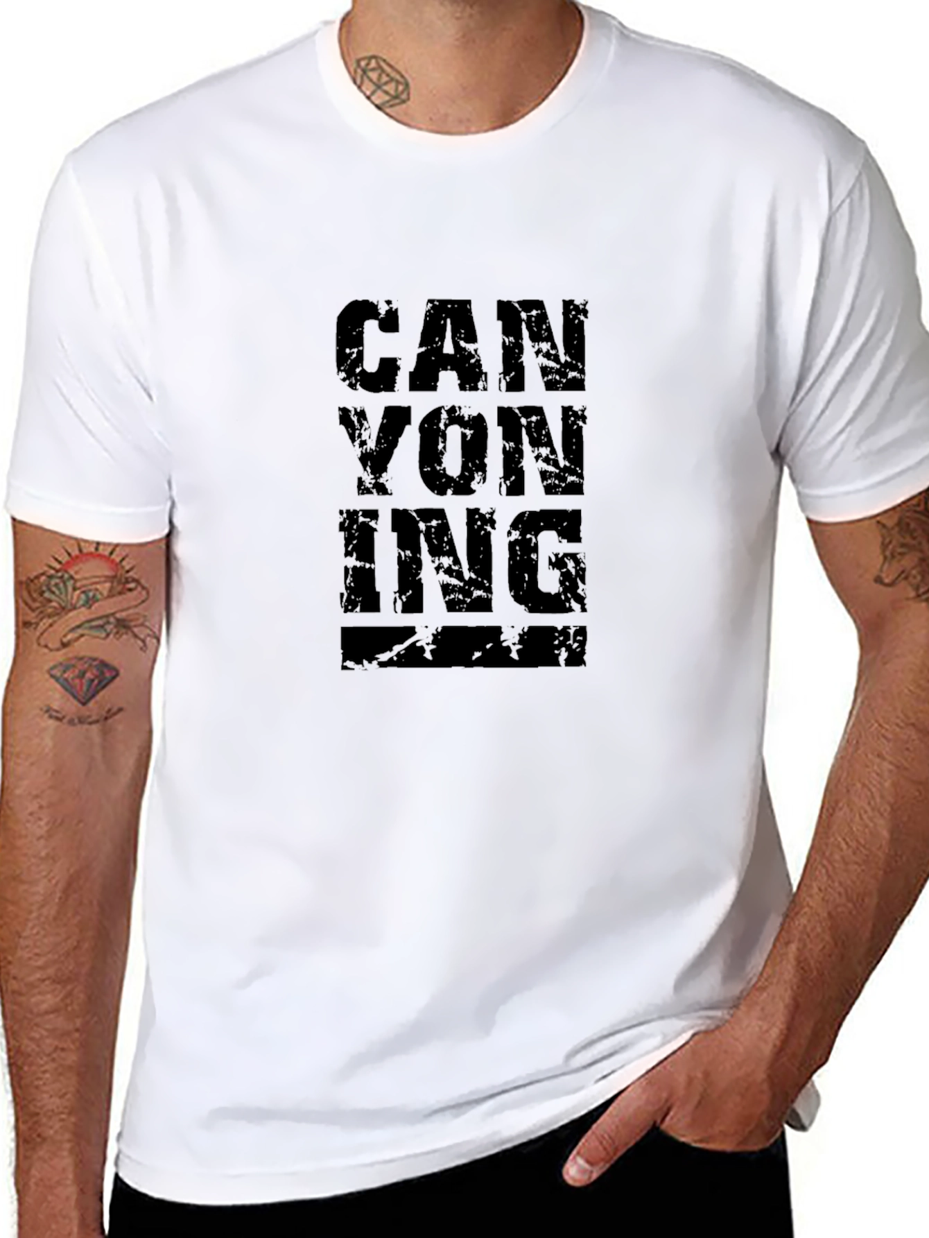 Elevate your outdoor style with this bold, black t-shirt featuring the word "CANYONING" vertically stacked in a distressed, urban-inspired font. Crafted from a comfortable, breathable fabric, this tee offers both style and practicality for your next adventure. The print design is eye-catching and makes a statement. Perfect for canyoning enthusiasts or anyone who appreciates unique graphic tees. Pair it with your favorite jeans or shorts for a casual, adventure-ready look. Show off your passion for canyoning with this standout t-shirt!
