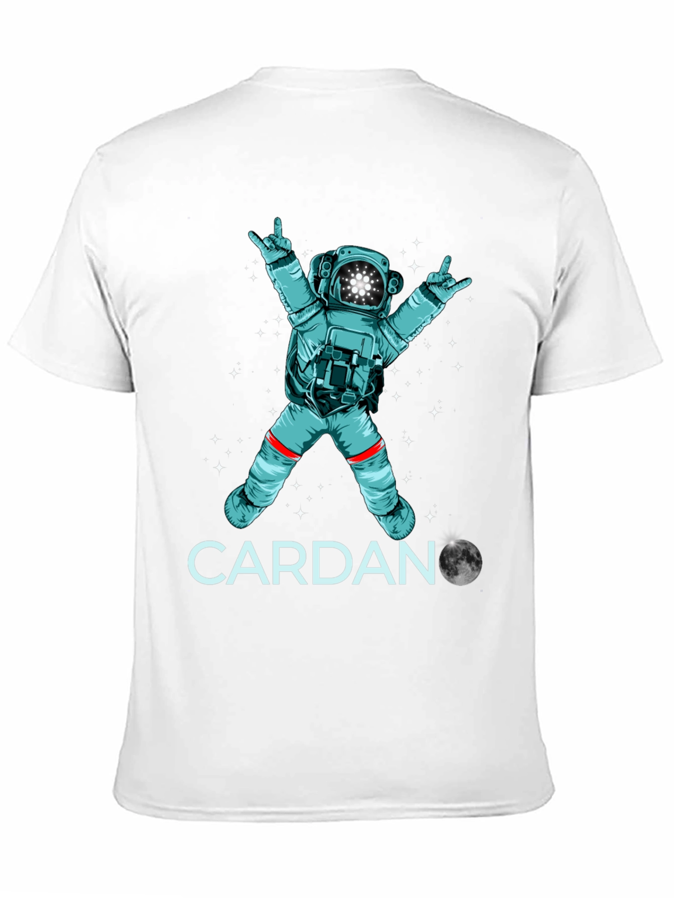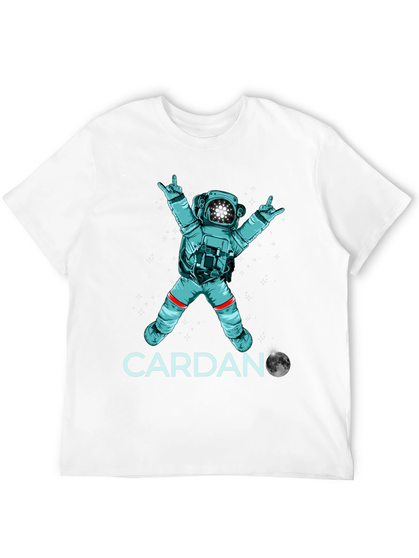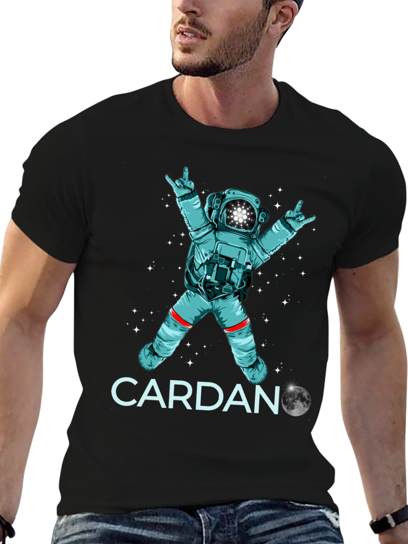 Show your love for Cardano with this eye-catching black T-shirt! Featuring a vibrant graphic of an astronaut rocking out amidst a starry backdrop, this shirt is sure to turn heads. The design includes the word "CARDANO" in a sleek, modern font complemented by a stylized moon. Made from a comfortable material, this tee is perfect for casual wear, crypto meetups, or as a unique gift for the Cardano enthusiast in your life. Elevate your wardrobe with this unique crypto-themed apparel!