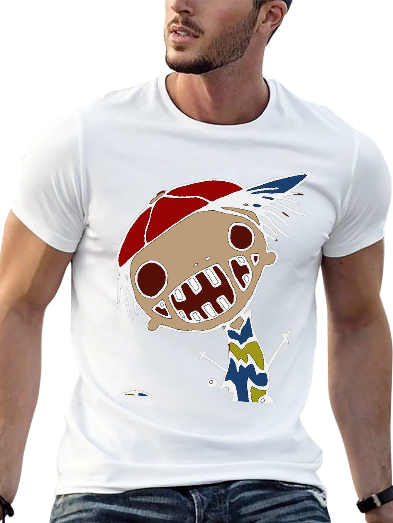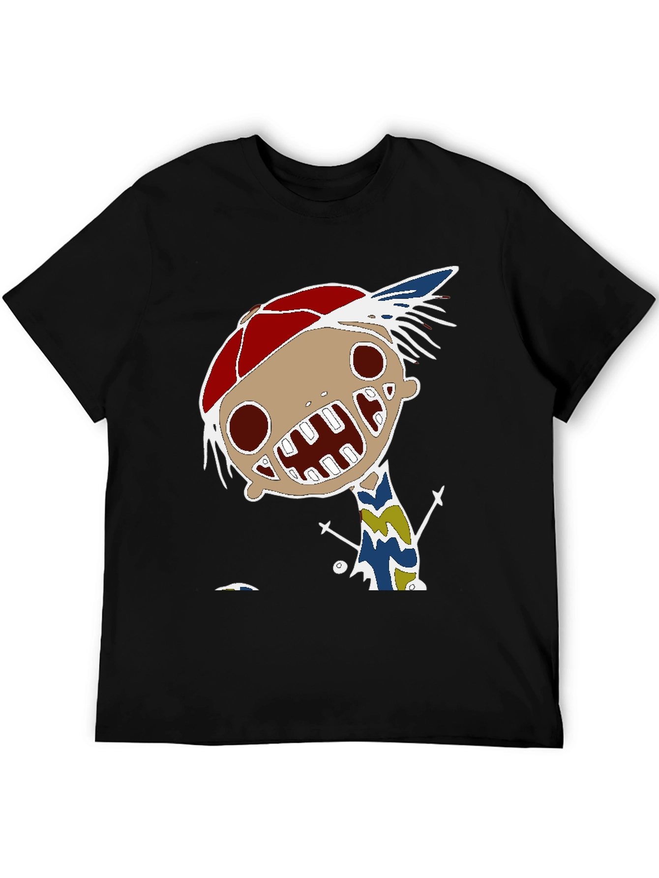 Show off your playful side with this eye-catching black t-shirt featuring a unique cartoon character. The design includes a whimsical figure with a red hat, exaggerated features, and a quirky, colorful outfit. Made from what appears to be a soft and breathable cotton blend, this tee offers both comfort and style. The bold graphic is sure to turn heads and spark conversation. Ideal for casual outings, social gatherings, or adding a touch of fun to your everyday wardrobe. Express your individuality with this distinctive t-shirt.