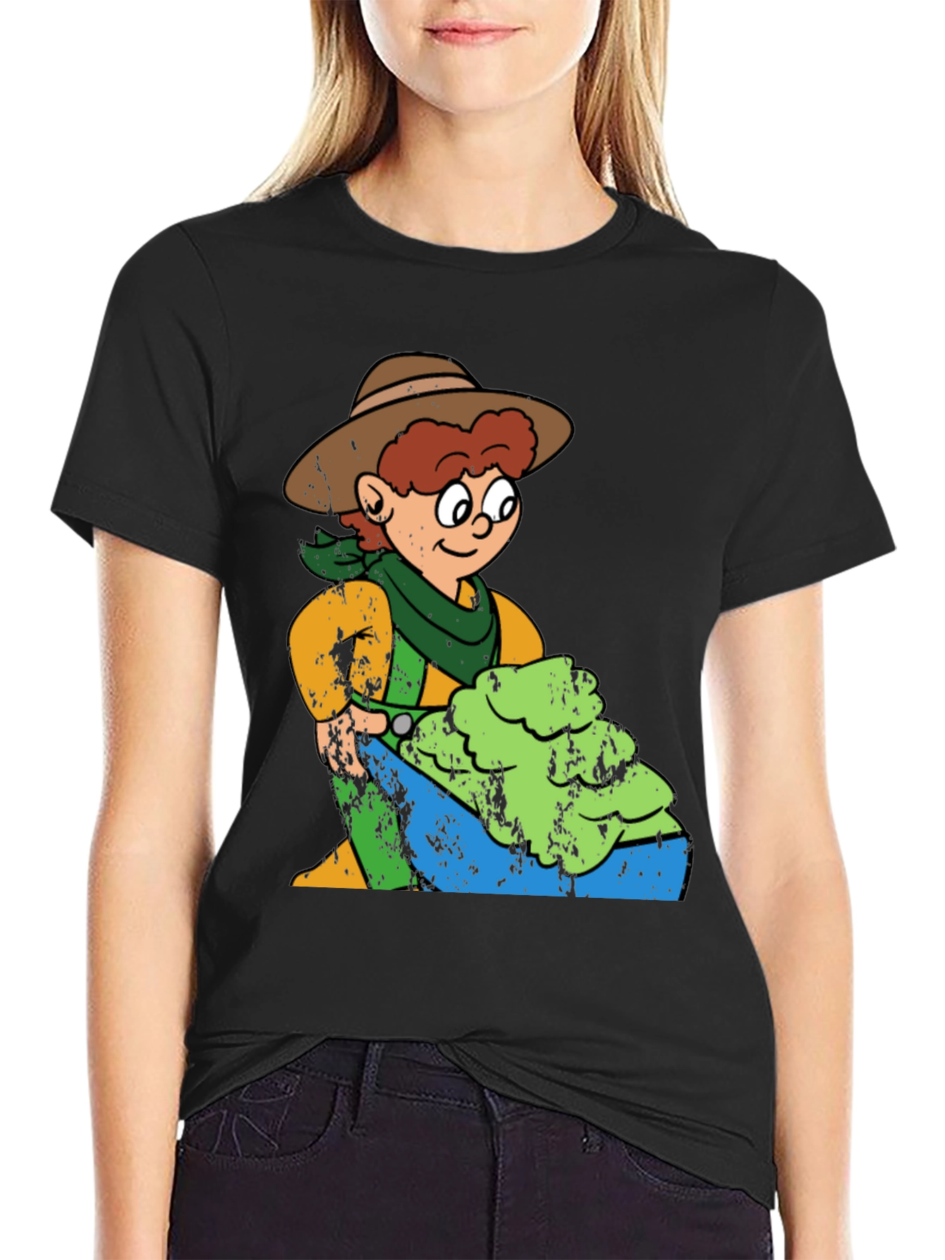 Add a touch of whimsy to your wardrobe with this fun graphic tee! This black t-shirt features a cartoon-style illustration of a cowboy, rendered in vibrant colors with a distressed texture. The design showcases a character with a hat and bandana, holding a pile of (possibly) gold nuggets. Made from a comfortable-looking fabric, this shirt is perfect for casual wear. It's a great conversation starter and a unique way to express your playful side. Wear it to social gatherings, casual outings, or even as a fun everyday staple. Makes a great gift for cartoon lovers, fans of vintage graphics, or anyone who enjoys a touch of humor in their style!