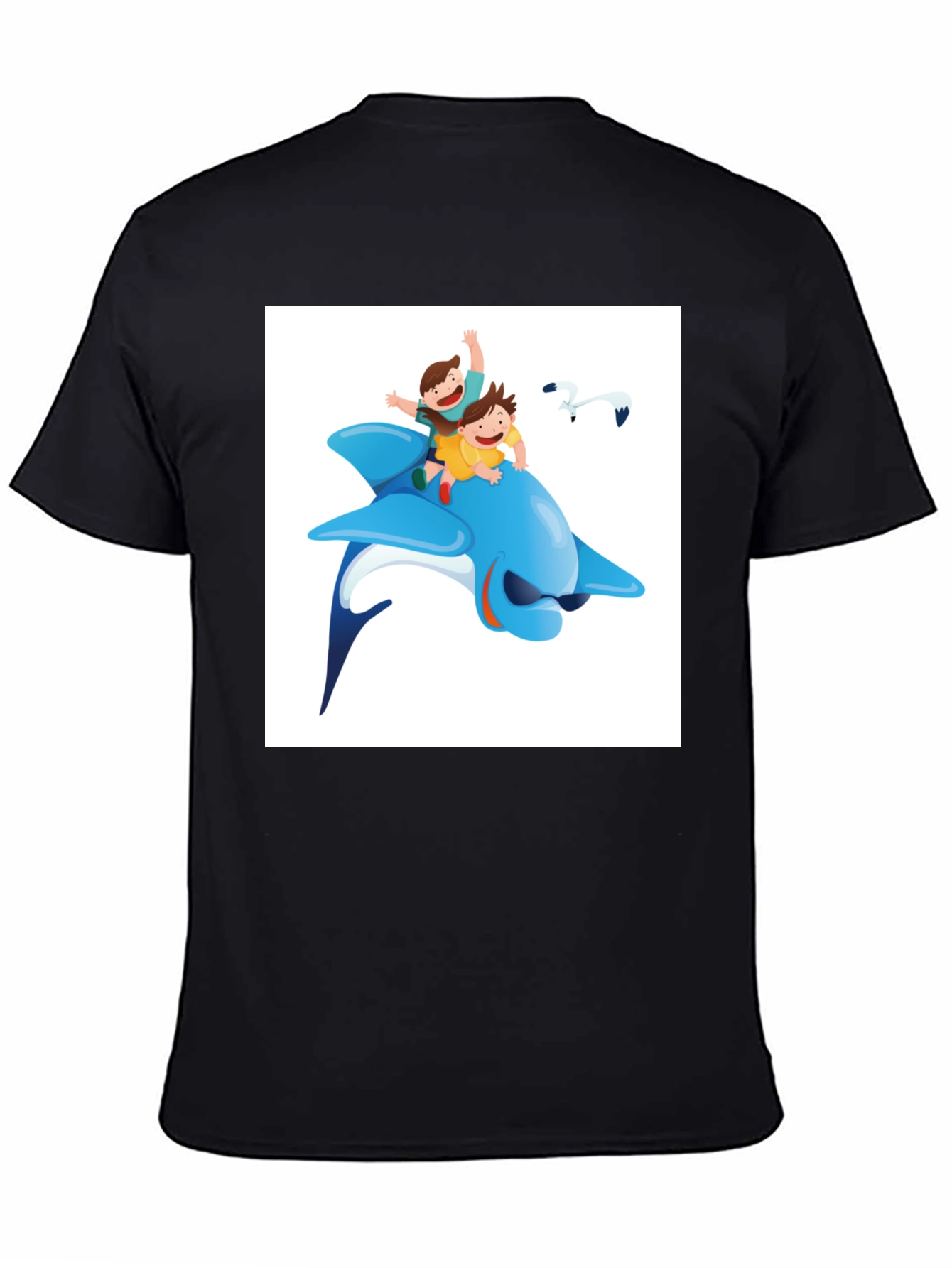 This stylish black t-shirt features a playful graphic print of two children riding a blue cartoon dolphin. The vibrant design adds a touch of fun and whimsy to your everyday wardrobe. Made from comfortable, breathable fabric, this tee is perfect for casual outings, vacations, or simply lounging at home. The high-quality print ensures that the image stays bright and vibrant, even after multiple washes. Get ready to make a statement with this unique and eye-catching t-shirt!