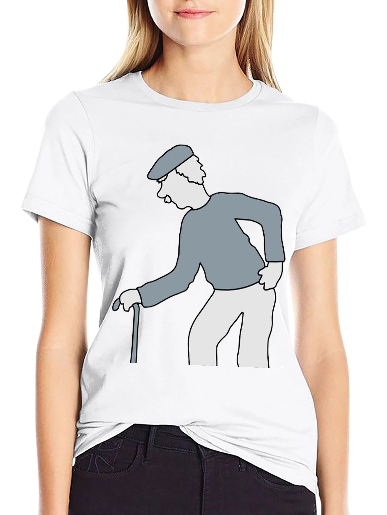 This black t-shirt features a cartoon graphic of an elderly gentleman. The man is illustrated with a light blue sweater, white pants, and a matching hat, leaning on a gray cane. The graphic adds a whimsical and humorous touch to the classic tee, making it a unique wardrobe addition. Made with comfortable materials, it's perfect for casual wear, while showcasing your fun personality. This t-shirt is sure to spark conversations and bring a smile to those around you. Wear it on your next outing for a blend of comfort and distinctive style.