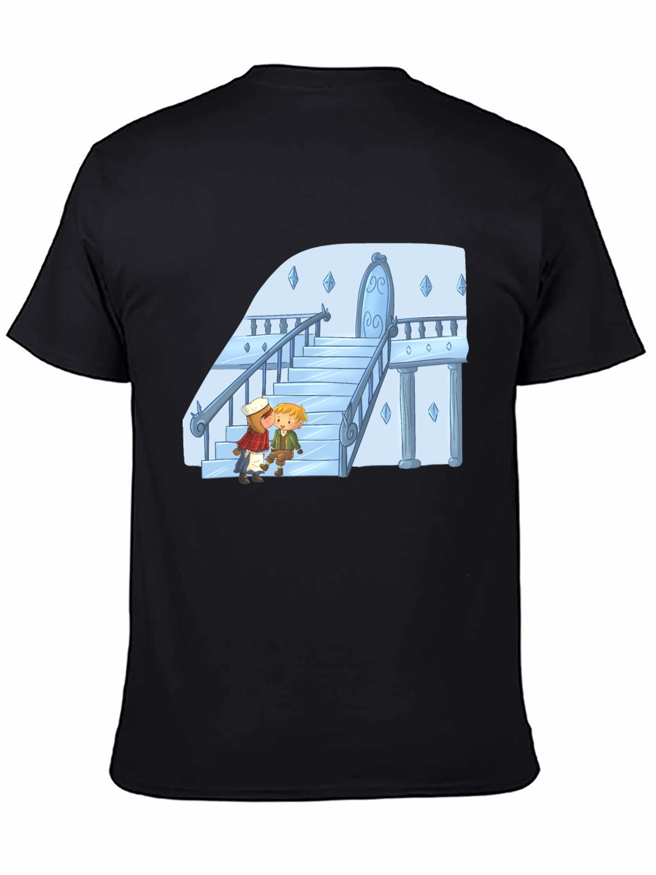 This classic black t-shirt features a whimsical cartoon design of two children sharing a kiss on a staircase. The illustration is rendered in soft, inviting colors, making it a fun and cheerful addition to your wardrobe. Made from comfortable, breathable fabric, this t-shirt is perfect for everyday wear. The design is eye-catching and unique, sure to spark conversation and bring a smile to those around you. Wear it casually with jeans or dress it up with a blazer for a touch of playful style. Great for anyone who enjoys lighthearted, artistic designs and values comfort.