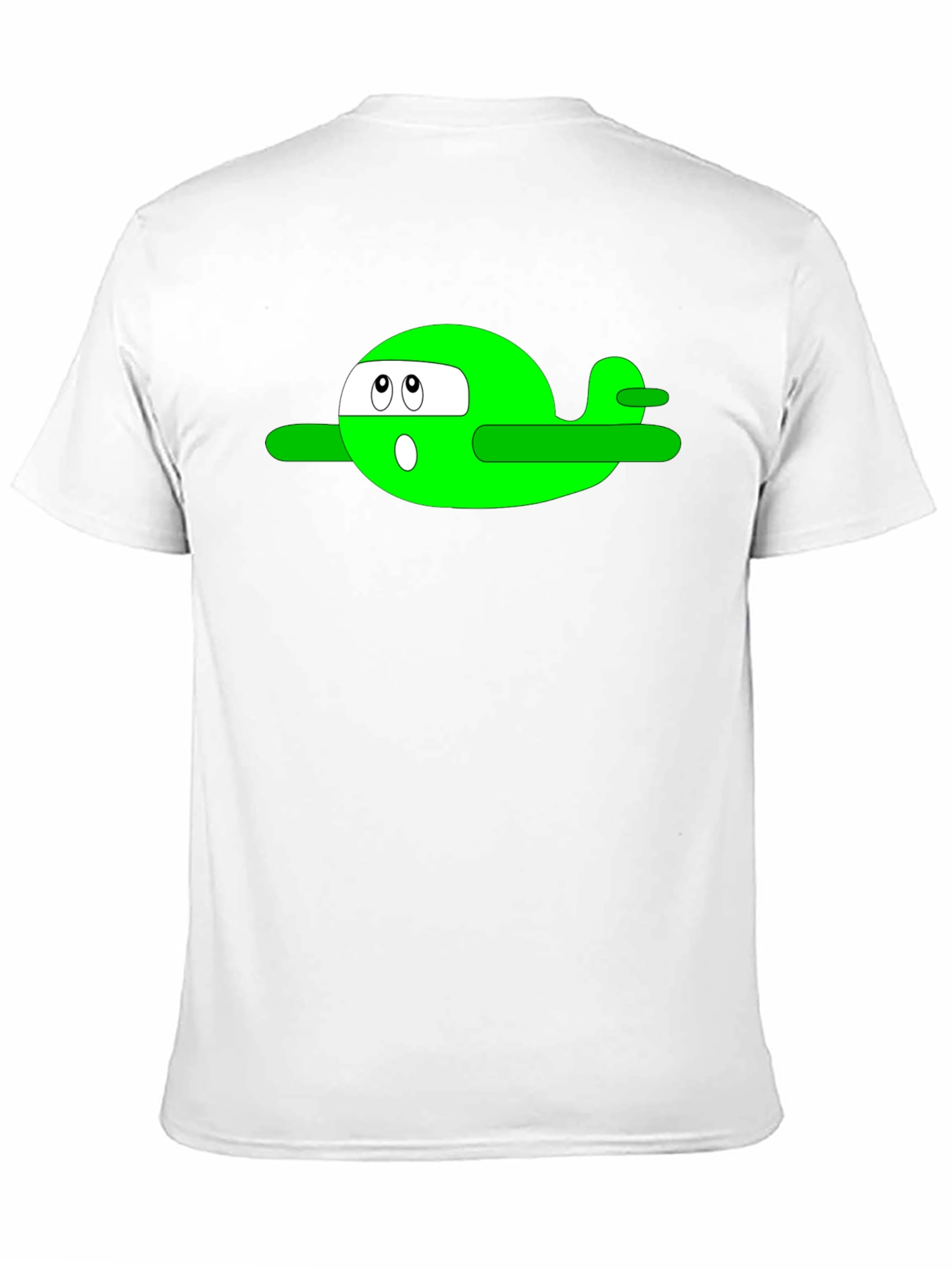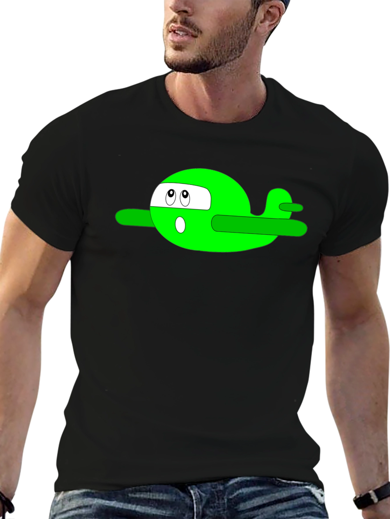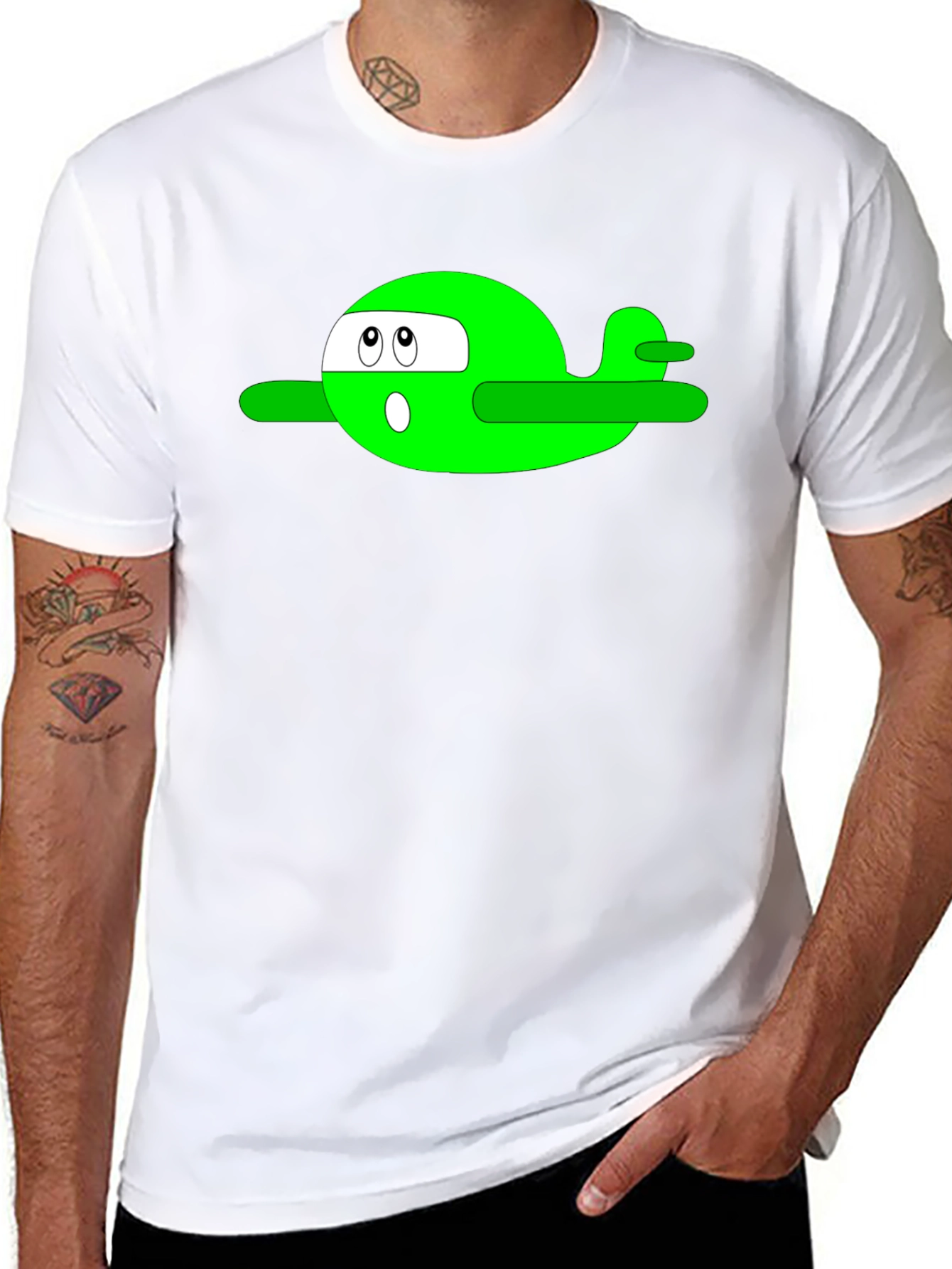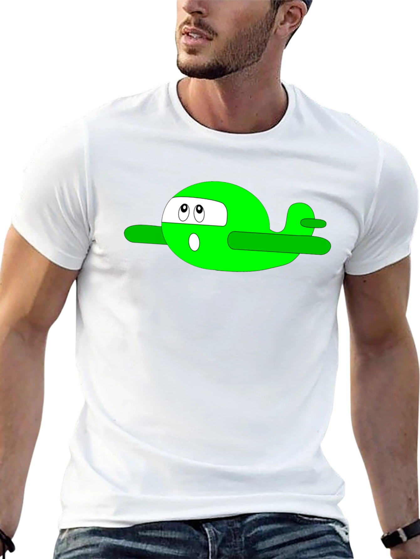 This eye-catching black t-shirt features a vibrant green cartoon airplane graphic. The playful design gives the plane a surprised expression. The shirt appears to be made from a soft, comfortable cotton blend, perfect for everyday wear. It's a fun and unique addition to any wardrobe, sure to spark conversations and bring smiles. Ideal for casual outings, lounging at home, or showing off your quirky sense of style. Get ready to take flight in this one-of-a-kind tee!