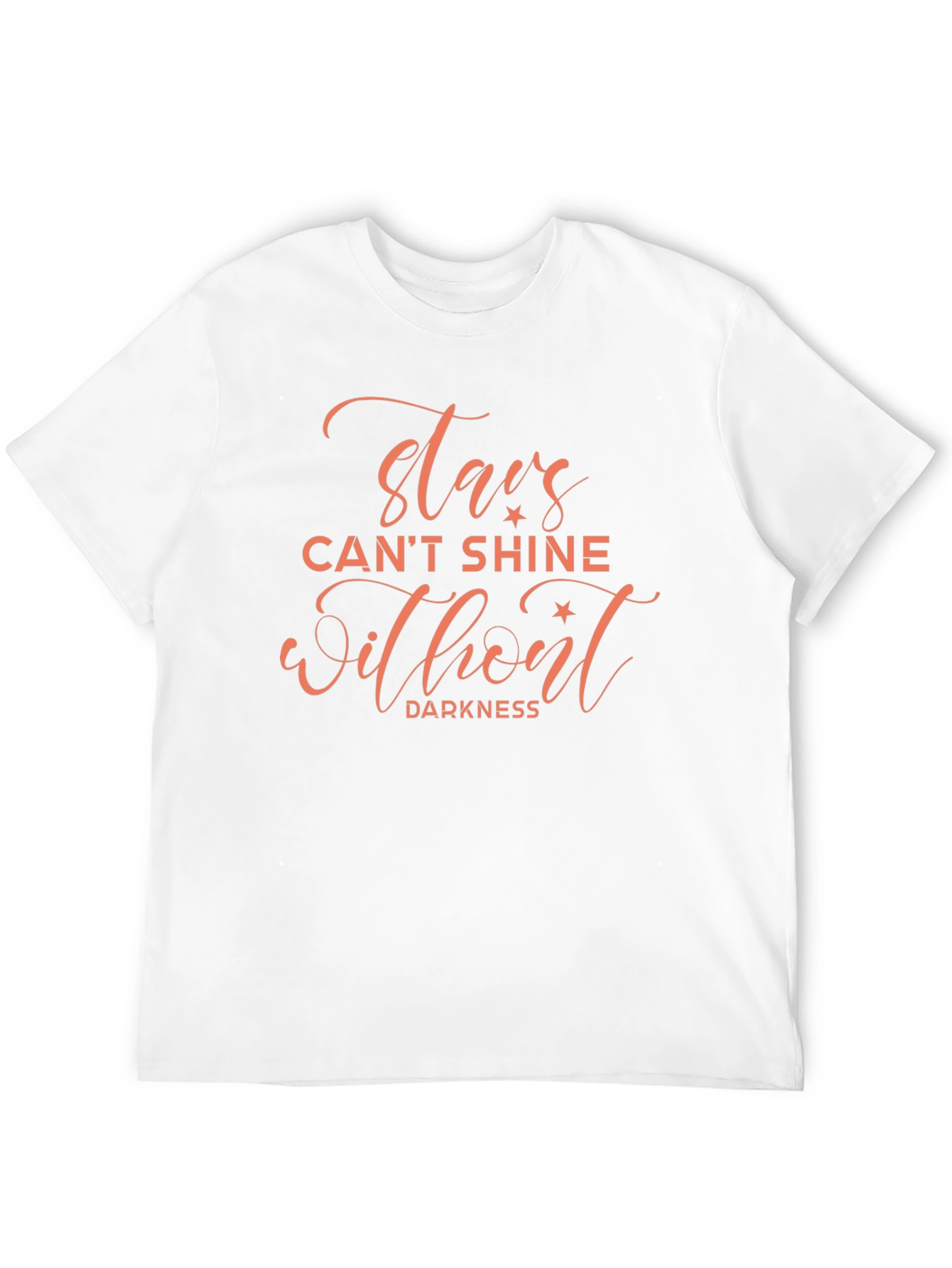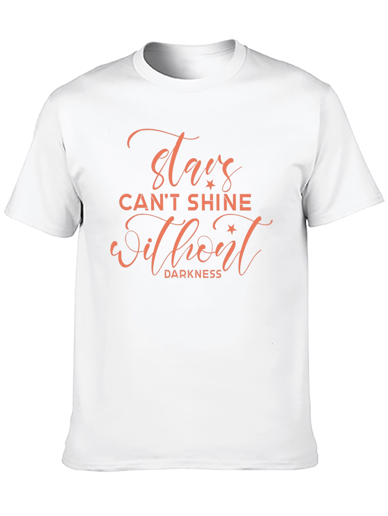 This stylish black t-shirt features an inspirational quote: "Stars can't shine without darkness." The coral-colored lettering is an eye-catching design element. Made from a soft, comfortable fabric, this t-shirt is perfect for everyday wear. The classic crew neck and short sleeves make it a versatile addition to any wardrobe. Show off your optimistic attitude with this unique and motivational tee. Ideal for casual outings, workouts, or lounging at home. Add a touch of positivity to your style today! The shirt's message makes it a thoughtful gift for someone special.