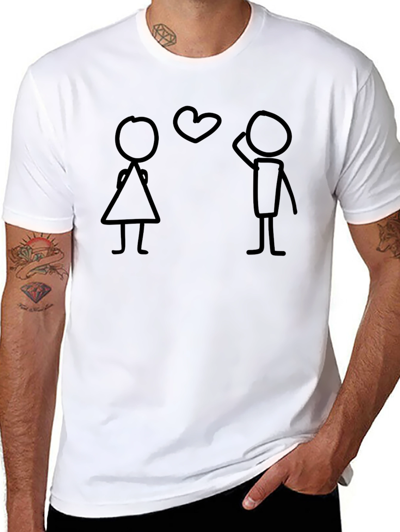 Show your affection with this adorable stick figure graphic t-shirt. The black tee features a charming minimalist design with two stick figures and a heart, creating a fun and playful look. This casual t-shirt is made from a comfortable, breathable fabric, perfect for everyday wear. Its versatile design makes it easy to pair with jeans, shorts, or skirts, making it ideal for casual outings, date nights, or simply lounging at home. Embrace the cuteness and add a touch of whimsical style to your wardrobe with this unique and eye-catching tee.