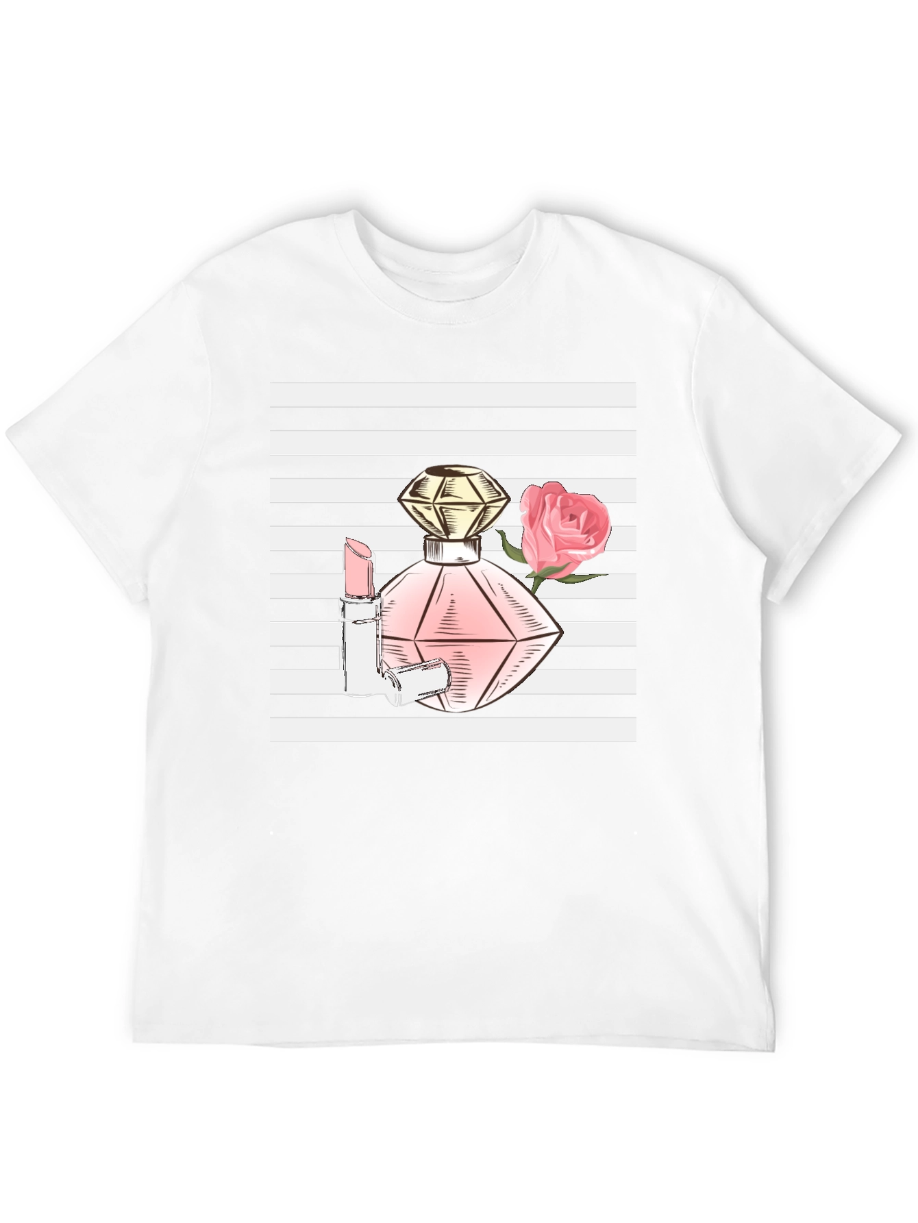 Elevate your casual wardrobe with this eye-catching black t-shirt. The shirt features a bold, artistic print showcasing a perfume bottle, lipstick, and rose set against a chic black and white striped backdrop. The design exudes elegance and sophistication. Made from a comfortable, breathable fabric, this tee is perfect for everyday wear. Pair it with jeans, shorts, or a skirt for a stylish and effortless look. Whether you're meeting friends for coffee or running errands, this unique t-shirt will make a statement and showcase your impeccable taste. Add a touch of glamour to your outfit with this fashionable piece.