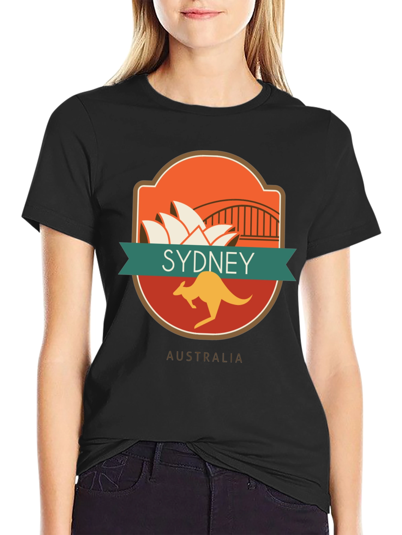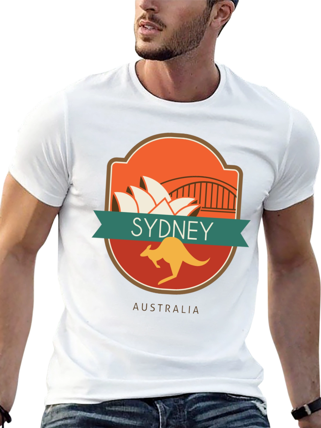 Showcase your love for Sydney and Australia with this unique graphic tee. The design features iconic imagery of Sydney's famous landmarks, including the Opera House and Harbour Bridge, as well as a kangaroo. The design is set within a badge design with a green banner across it with the text Sydney on it. Below is the text Australia. Made from comfortable materials, this t-shirt is perfect for everyday wear or as a souvenir. It's a great conversation starter and a stylish way to represent your travel adventures or Australian pride. Wear it casually with jeans or dress it up with a jacket.