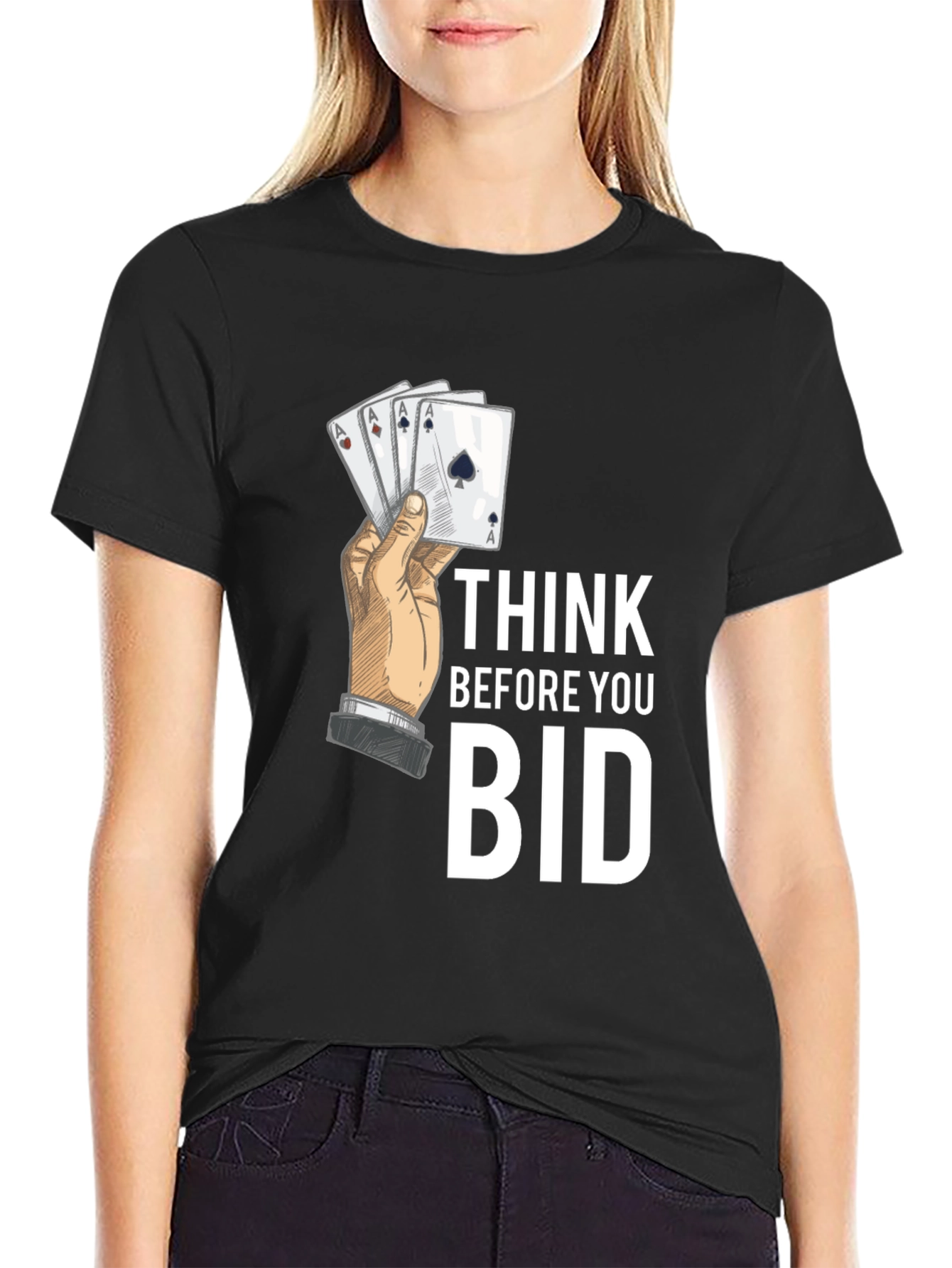 Show off your strategic side with this unique black T-shirt. The design features a hand holding a winning poker hand - four Aces. The words "Think Before You Bid" are emblazoned in bold white lettering, making it perfect for poker nights, casual outings, or as a conversation starter. Comfortable and stylish, this tee is a must-have for any card game enthusiast who likes to play smart. Wear your wit and skill with pride!