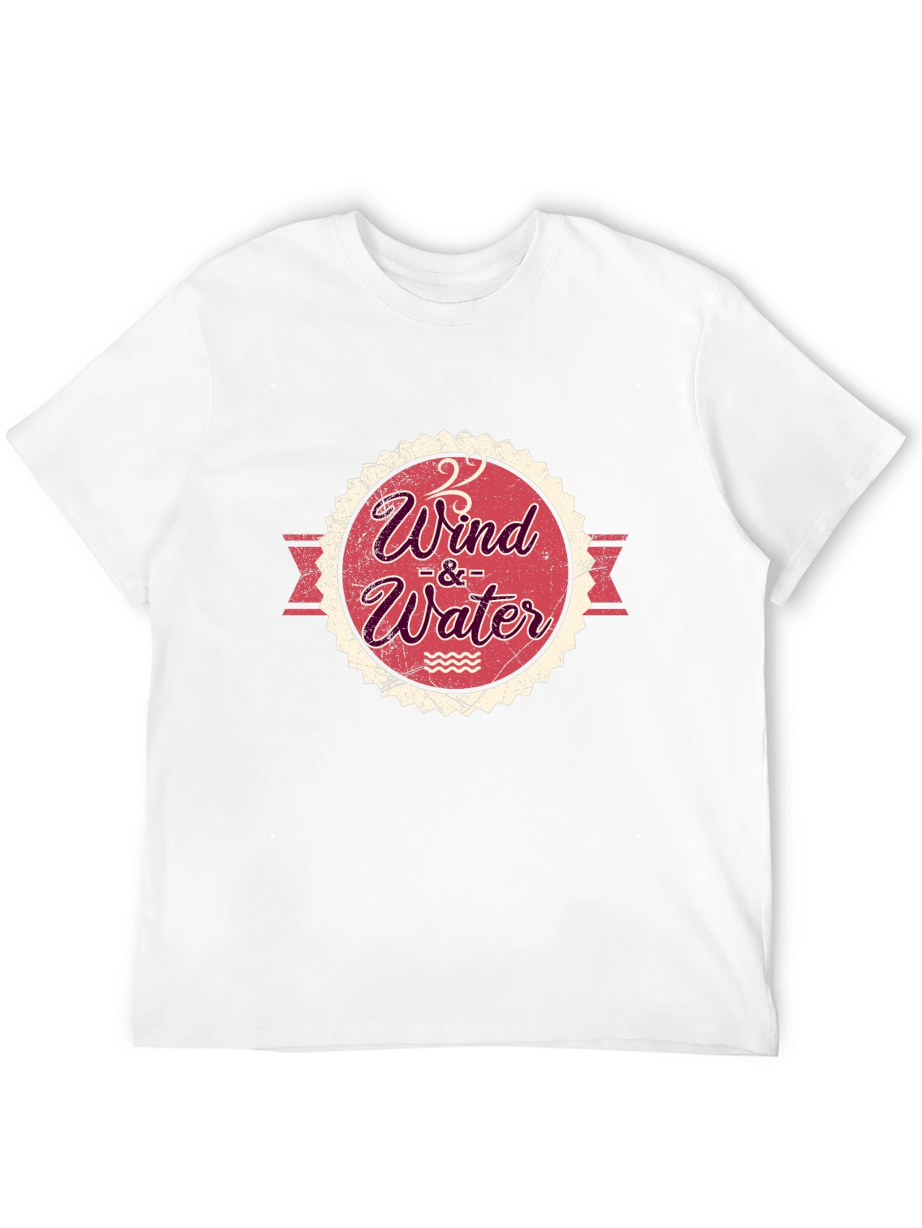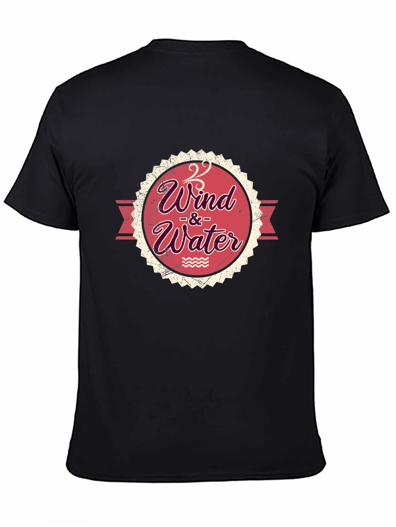 Embrace a relaxed vibe with this classic black t-shirt. Featuring a vintage-inspired "Wind & Water" graphic design, this tee is perfect for those who appreciate a touch of retro style. The design incorporates stylized text and wavy lines within a red and cream-colored circular emblem, making it eye-catching. Made from a comfortable-looking fabric, this tee is ideal for everyday wear. Pair it with your favorite jeans or shorts for a casual, cool look. This t-shirt is a must-have for anyone looking to add some unique character to their wardrobe. The short sleeves and classic crew neck provide a timeless fit, making it versatile for any occasion.